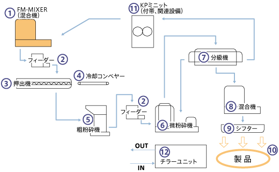 分級機によってバグフィルターへと捕集された過粉砕品を再度圧縮成型する事により原料へリサイクルしたり、